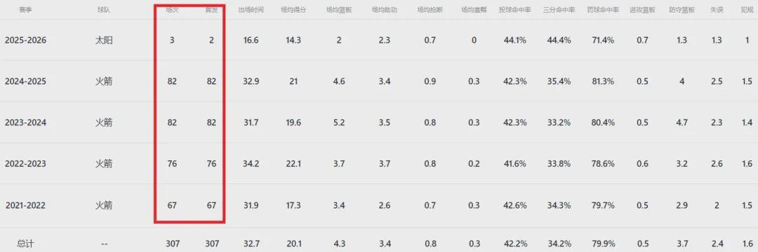 话说杰伦格林在火箭的四个赛季出勤率拉满,其中有两个赛季均是全勤,然而来到太阳之后却伤病不断......这哥们出生于2002年2月9日,21届榜眼秀,仍有巨大潜力可以挖掘,前提是得保持长久健康。